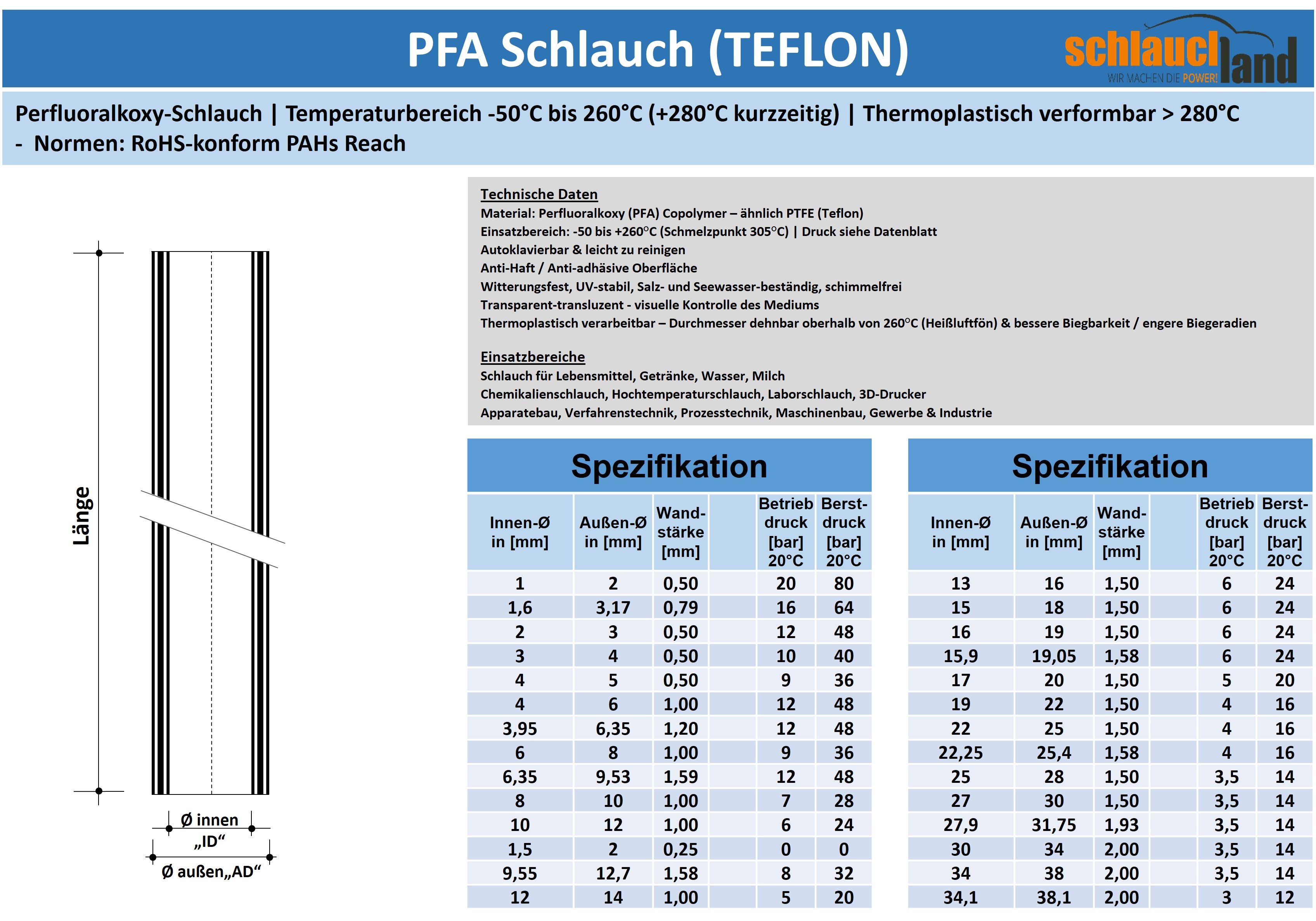 • Einsatzbereich: -50 bis +260°C (Schmelzpunkt 305°C) | Druck siehe Datenblatt