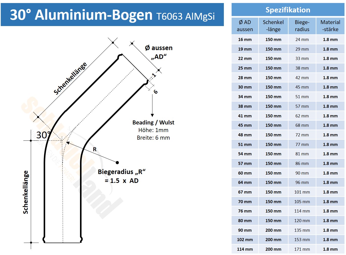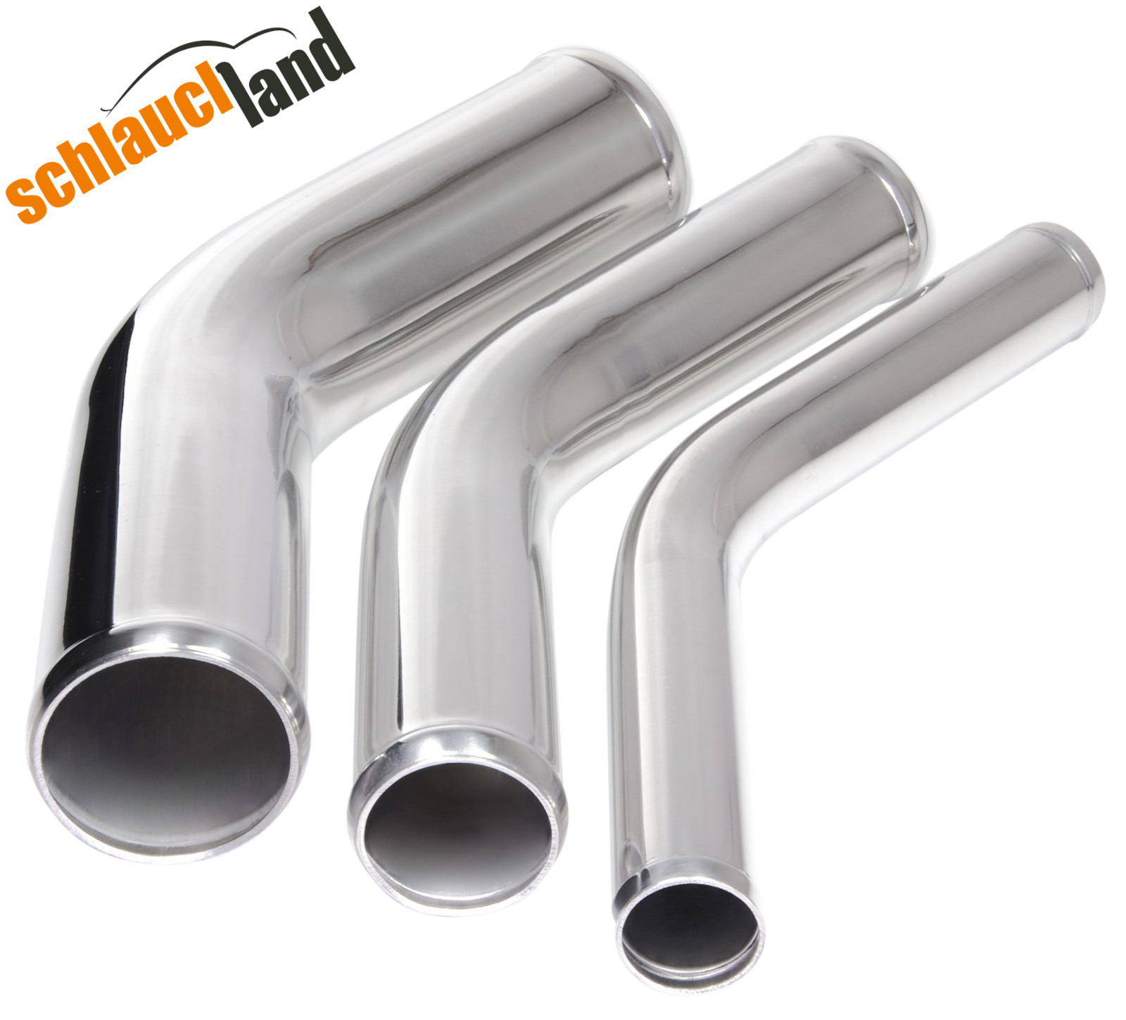 ALU Alurohr – 30° Bogen aus T6063 AlMgSi (schweißbar) für höchste Qualitätsansprüche. Die Rohrenden der Alurohre sind mit einer Bördelung (Wulst) versehen. Diese Erhöhung am Rohrende um ca. 1 mm gewährleistet einen dichten Anschluss von Schläuchen und garantiert einen festen Halt von Schlauchschellen auch unter extremen Bedingungen. Die hochglanz-polierte Oberfläche der Alurohre sorgt für eine hochwertige, edle Optik.