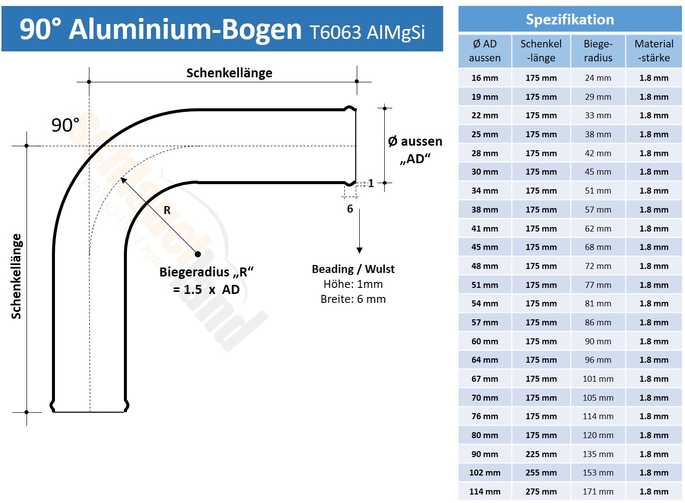 Bsp: Außendurchmesser = 60mm → Biegeradius = 90mm - Material: AlMgSi T6063 - rostfrei – nichtrostend – gut schweißbar