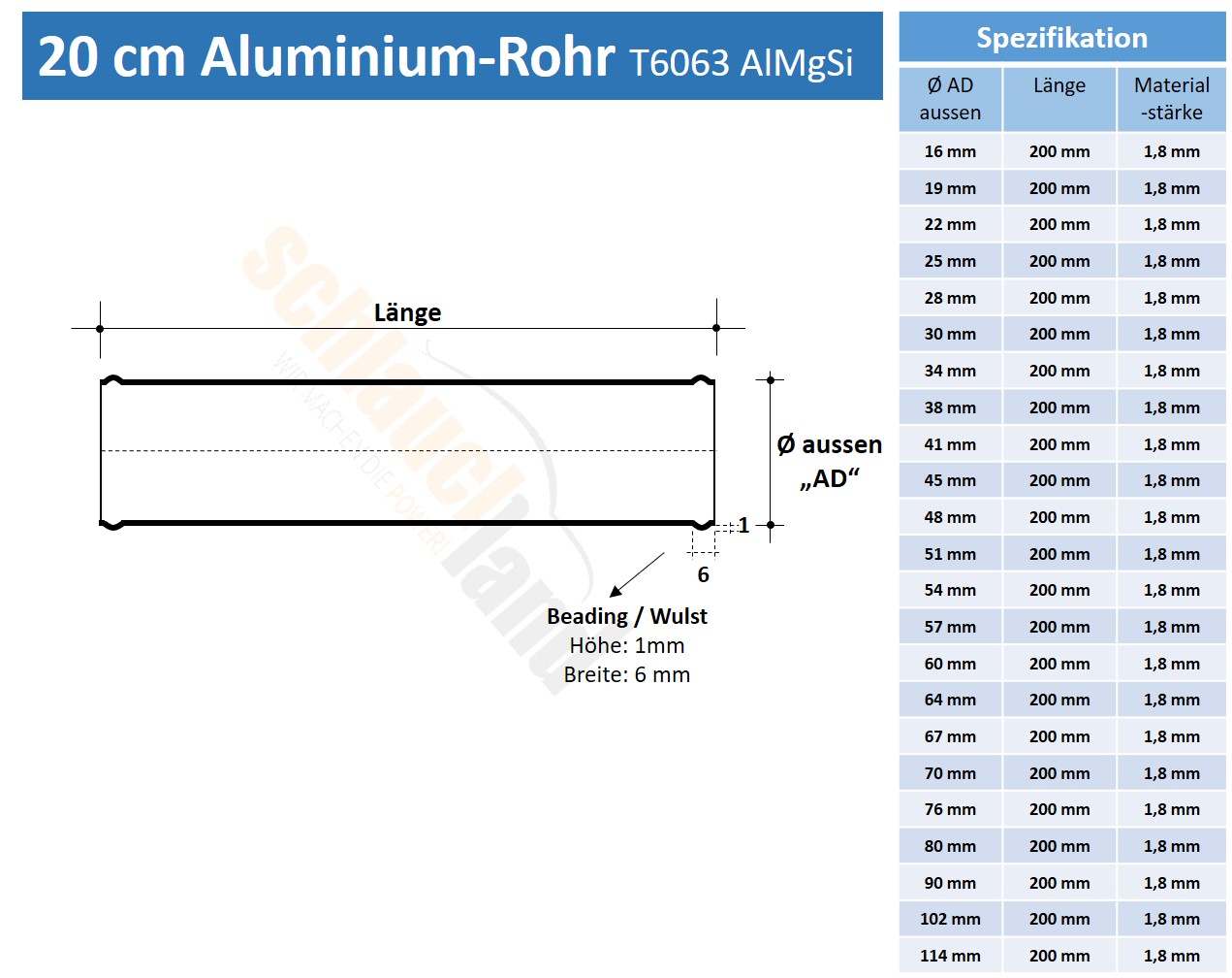 20 cm ALU Alurohr – Aluminium-Rohr gerade aus T6063 AlMgSi (schweißbar) für höchste Qualitätsansprüche. Die Rohrenden der Alurohre sind mit einer Bördelung (Wulst) versehen. Diese Erhöhung am Rohrende um ca. 1 mm gewährleistet einen dichten Anschluss von Schläuchen und garantiert einen festen Halt von Schlauchschellen auch unter extremen Bedingungen. Die hochglanz-polierte Oberfläche der Alurohre sorgt für eine hochwertige, edle Optik.