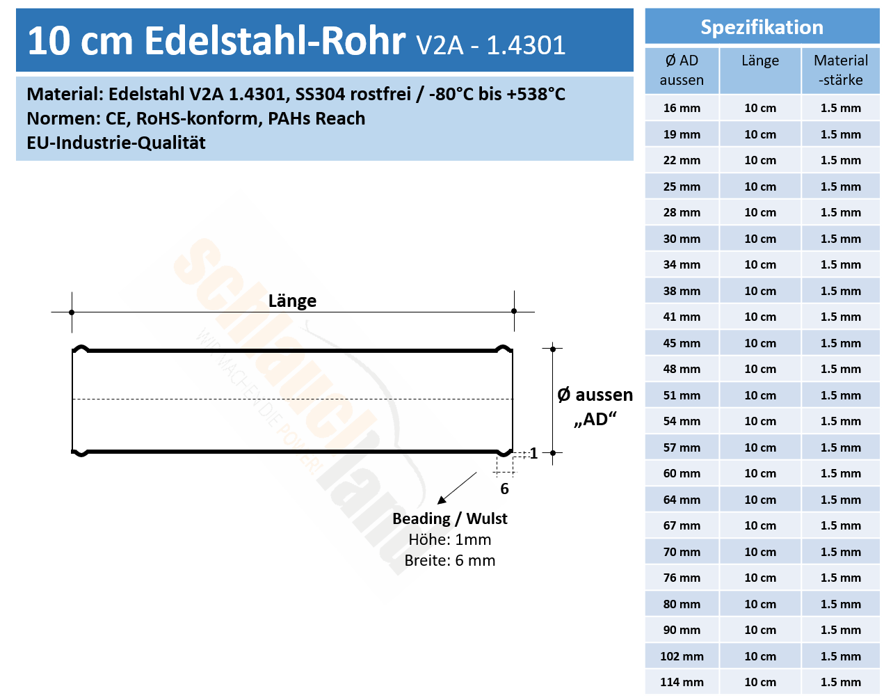 10 cm Edelstahlrohr aus rostfreiem V2A Edelstahl 1.4301 für höchste Qualitätsansprüche. Die Rohrenden der Edelstahl-Rohre haben eine Bördelung (Wulst) an den Enden. Die Erhöhung um ca. 1mm sichert einen dichten Anschluss an Schläuche und garantiert einen festen Halt von Schlauchschellen auch unter extremsten Bedingungen. Die hochglanz-polierte Oberfläche sorgt für eine hochwertige, edle Optik.