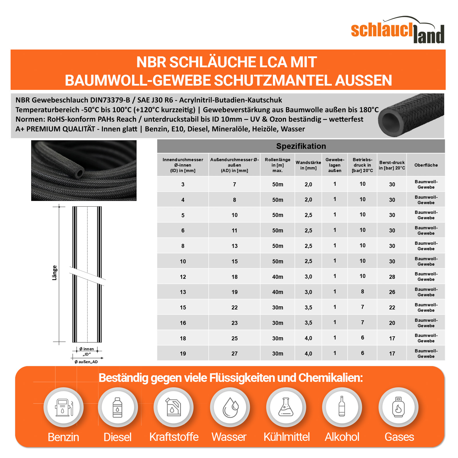 Benzinschlauch - Ölschlauch - Kraftstoffschlauch – Dieselschlauch – NBR Kautschuk Gummi mit Textil-Umflechtung aus Baumwoll-Textil-Gewebe in TOP-QUALITÄT. Außengewebe aus Baumwolle für erhöhte Temperatur- und Druckstabilität - widerstandsfähig, abriebfest, flexibel & langlebig. Beständig in vielen Flüssigkeiten & Chemikalien – Wasser, Öle, Fette, Benzin, Gase etc… Dauerhaft einsetzbar bis 100°C. Hochleistungs-Schläuche für Benzin-, Öl- und Treibstoff-Leitungen. Erste Wahl für Profis, Kfz, Maschinenbau, Heimwerker, Landwirtschaft, Gewerbe und Industrie.