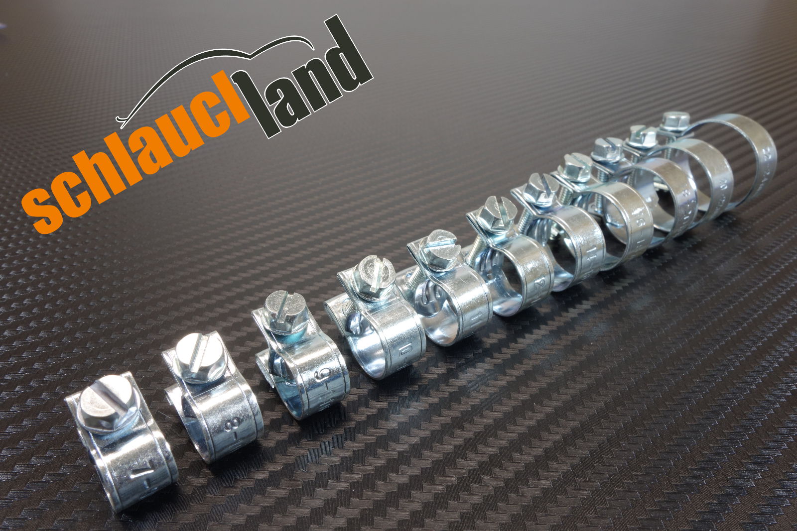 Schlauchschelle-Mini W1 mit Spannbacken aus vergütetem, verzinktem Stahl in TOP-QUALITÄT. Edelstahlschelle, Spannbackenschelle. Kleine und schmale Ausführung – für beengte Platzverhältnisse - Erste Wahl für Profis, Gewerbe & industrielle Anwendungen mit hohen Anforderungen. Abgerundete Kanten zum Schutz von Schläuchen, Kabeln, ... Einsatz z.B. in Kfz, Maschinenbau, Landwirtschaft, Sonderkonstruktionsbau, Traktoren, Boote, Schiffe oder Industrieanlagen.