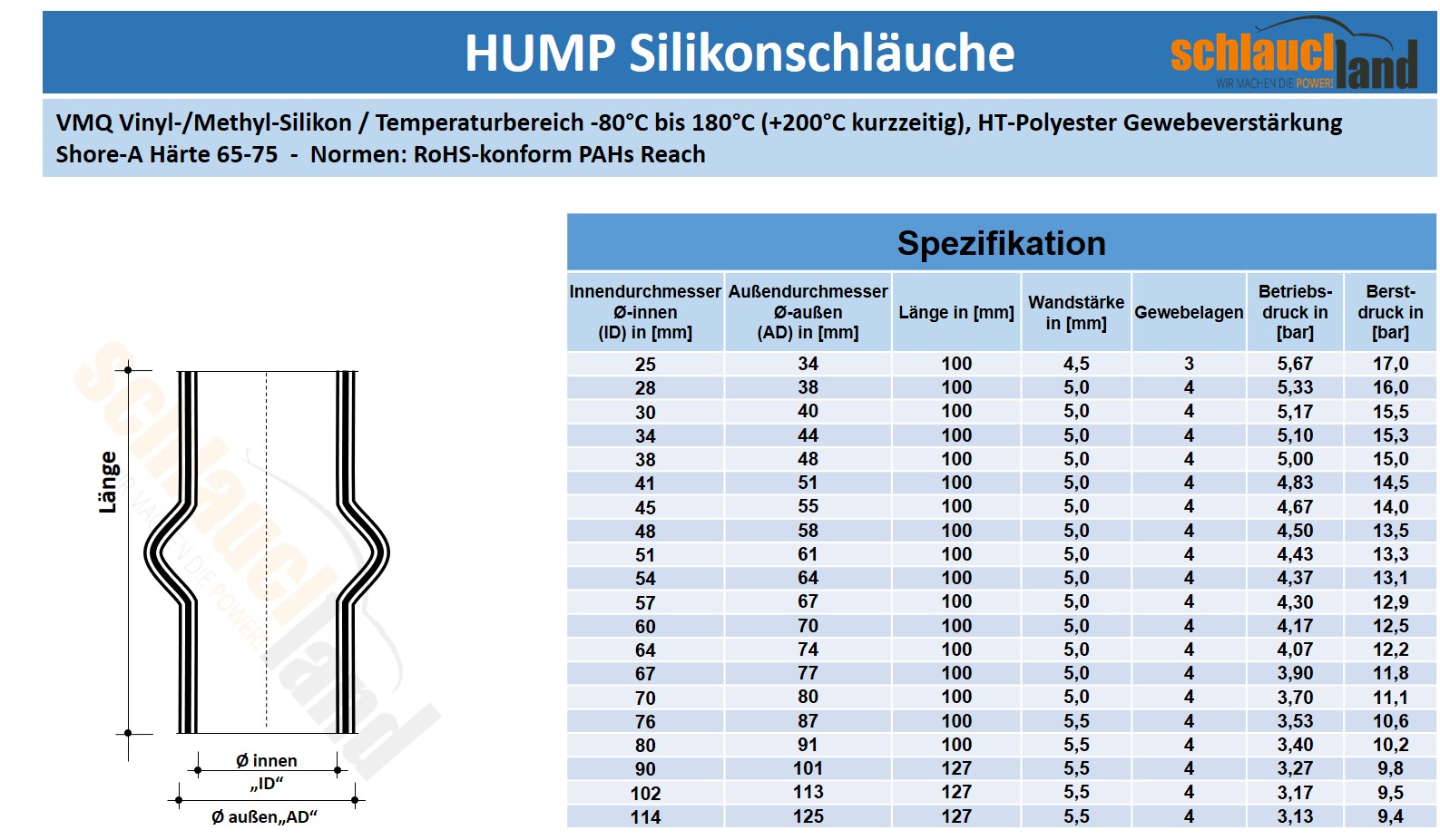 • Verstärkung: 3-5 lagiger Gewebeeinsatz aus HT-Polyester, siehe Tabelle