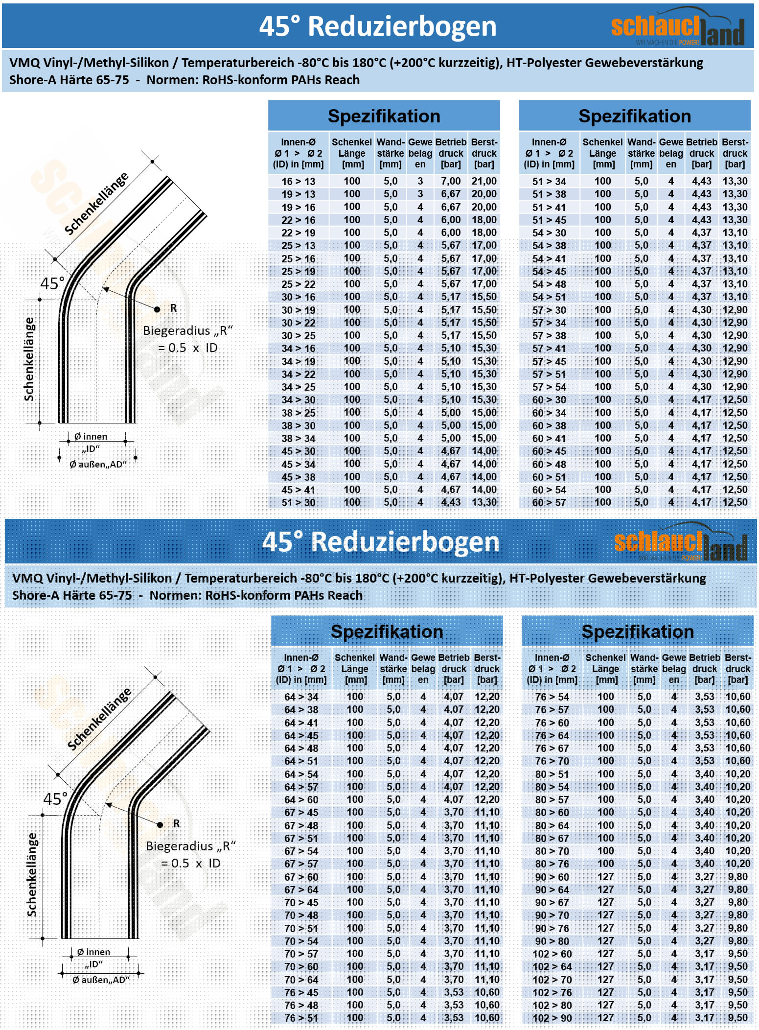 45° Silikonschlauch Reduzierbogen in TOP-QUALITÄT mit mehrlagiger Gewebeverstärkung aus ultrastarkem, doppelt vernetztem HT-Polyester. Vergütete & glänzende Oberflächen - widerstandsfähig, flexibel & langlebig. Beständig in vielen Flüssigkeiten & Chemikalien – Wasser, Kühlmittel, Alkohole, Luft, Gase, Ozon etc… Dauerhaft einsetzbar bis 180°C. High-Performance Schläuche für Luft-, Kühl- und Unterdrucksysteme. Erste Wahl für Profis, Kfz, Maschinenbau, Heimwerker, Landwirtschaft, Gewerbe und Industrie.
